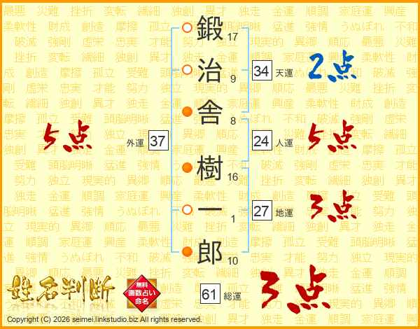 鍛(17画)治(9画)舎(8画) 樹(16画)一(1画)郎(10画)
