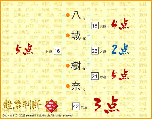 八(8画)城(10画) 樹(16画)奈(8画)