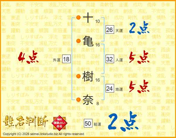 十(10画)亀(16画) 樹(16画)奈(8画)