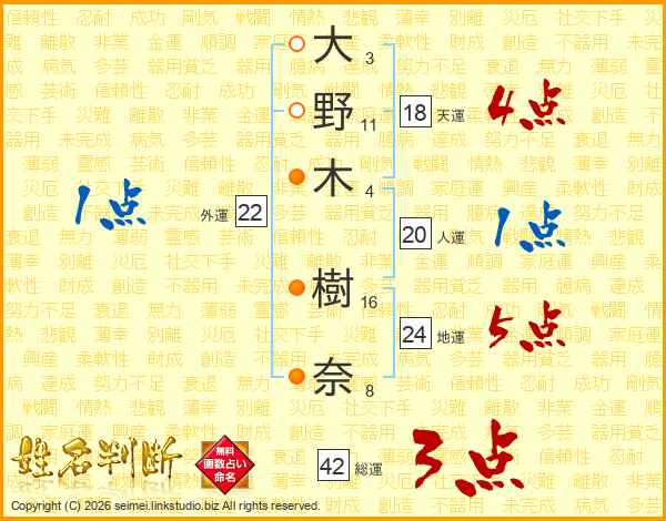 大(3画)野(11画)木(4画) 樹(16画)奈(8画)