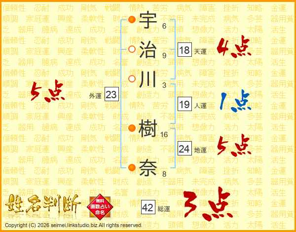 宇(6画)治(9画)川(3画) 樹(16画)奈(8画)