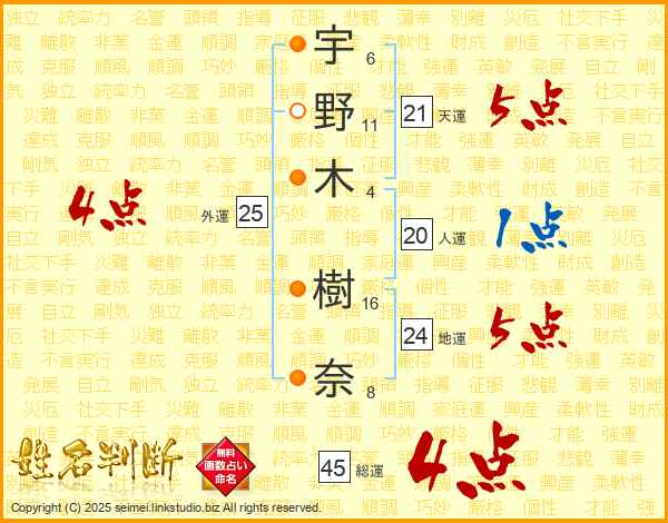 宇(6画)野(11画)木(4画) 樹(16画)奈(8画)