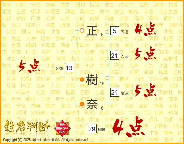 あなたの人生を表す1番重要な運勢です。生涯を通じて影響する総合運となり、主に50歳以降の晩年期に影響を及ぼします。苗字と名前の合計画数。