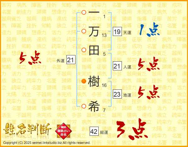 一(1画)万(13画)田(5画) 樹(16画)希(7画)