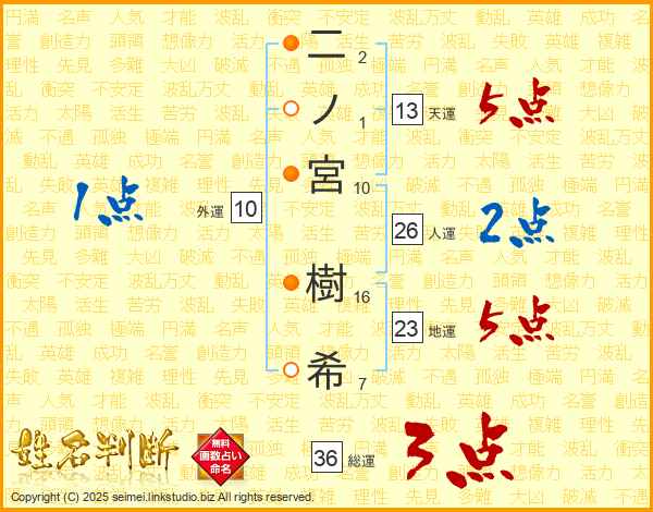 二(2画)ノ(1画)宮(10画) 樹(16画)希(7画)
