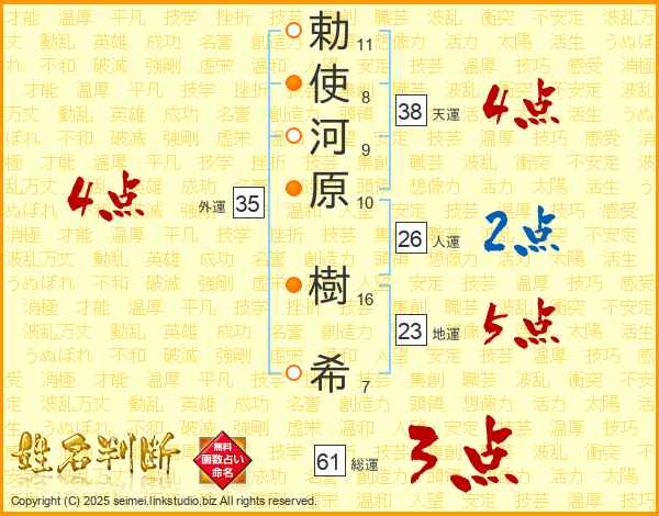 勅(11画)使(8画)河(9画)原(10画) 樹(16画)希(7画)