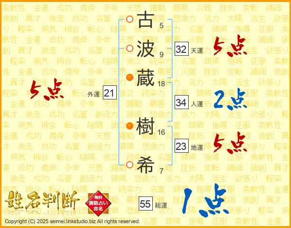 古(5画)波(9画)蔵(18画) 樹(16画)希(7画)