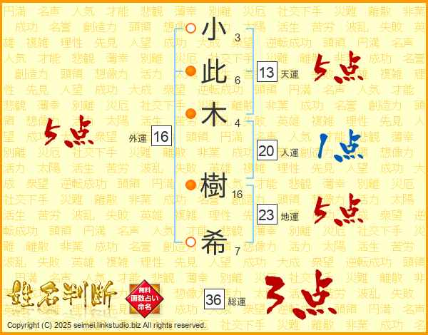 小(3画)此(6画)木(4画) 樹(16画)希(7画)