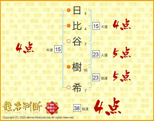日(4画)比(4画)谷(7画) 樹(16画)希(7画)