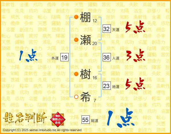 棚(12画)瀬(20画) 樹(16画)希(7画)