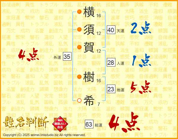 横(16画)須(12画)賀(12画) 樹(16画)希(7画)