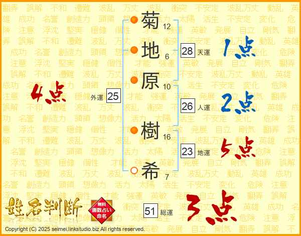 菊(12画)地(6画)原(10画) 樹(16画)希(7画)