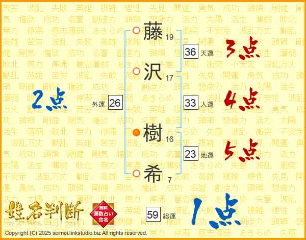 藤(19画)沢(17画) 樹(16画)希(7画)
