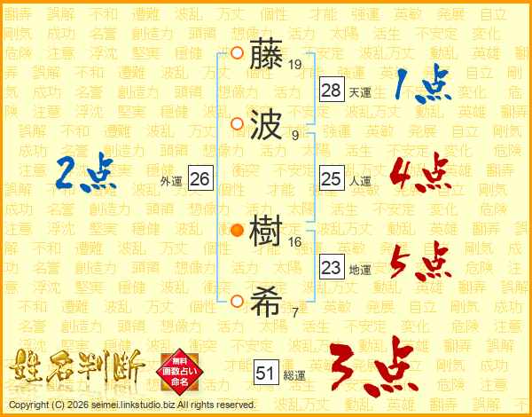 藤(19画)波(9画) 樹(16画)希(7画)