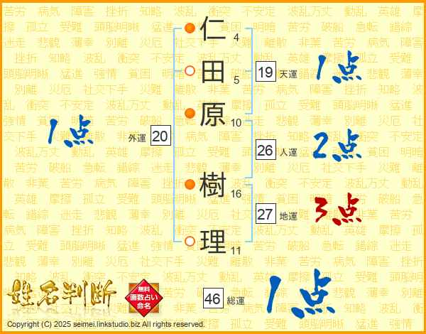 仁(4画)田(5画)原(10画) 樹(16画)理(11画)