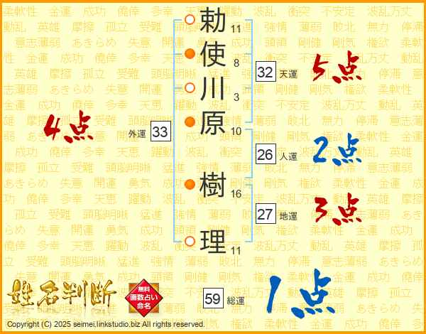 勅(11画)使(8画)川(3画)原(10画) 樹(16画)理(11画)