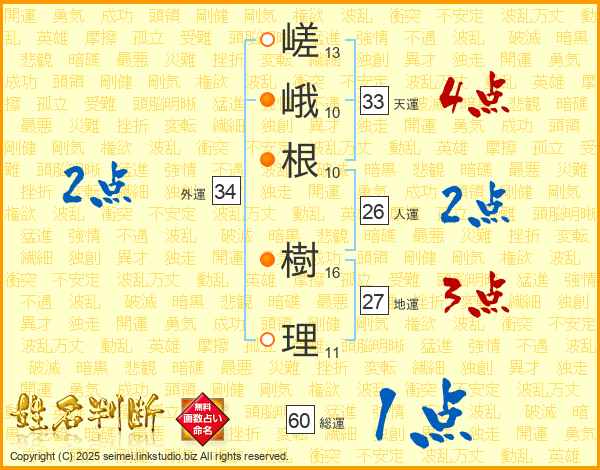 嵯(13画)峨(10画)根(10画) 樹(16画)理(11画)