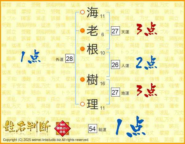 海(11画)老(6画)根(10画) 樹(16画)理(11画)