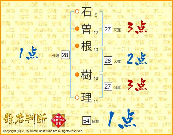 石(5画)曽(12画)根(10画) 樹(16画)理(11画)