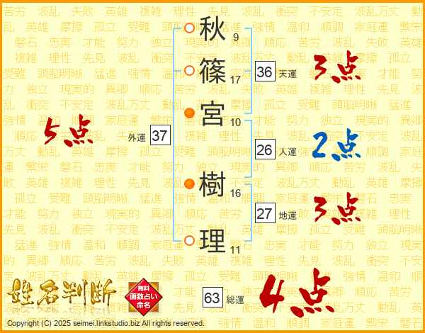 秋(9画)篠(17画)宮(10画) 樹(16画)理(11画)