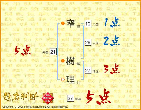 窄樹理さんの総運は37画の5点!