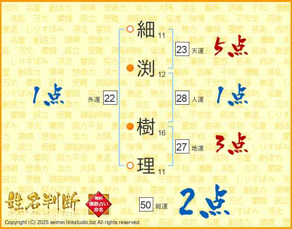 あなたの人生を表す1番重要な運勢です。生涯を通じて影響する総合運となり、主に50歳以降の晩年期に影響を及ぼします。苗字と名前の合計画数。