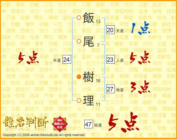 飯(13画)尾(7画) 樹(16画)理(11画)
