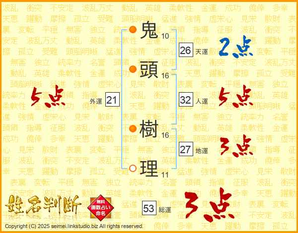 鬼(10画)頭(16画) 樹(16画)理(11画)