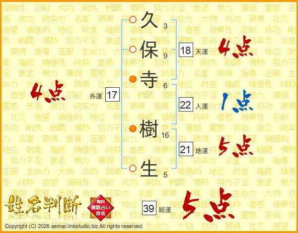 久保寺樹生さんの総運は39画の5点!