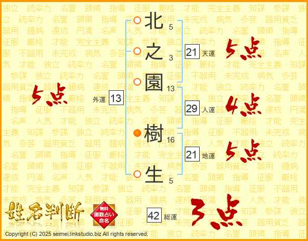 北之園樹生さんの地運は21画の5点!