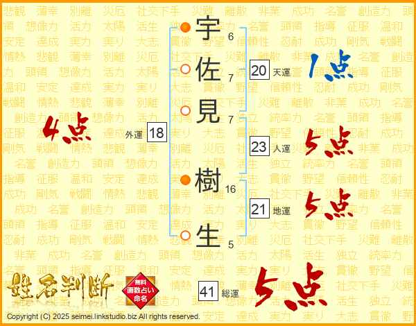 宇(6画)佐(7画)見(7画) 樹(16画)生(5画)