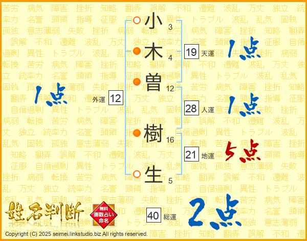 小(3画)木(4画)曽(12画) 樹(16画)生(5画)