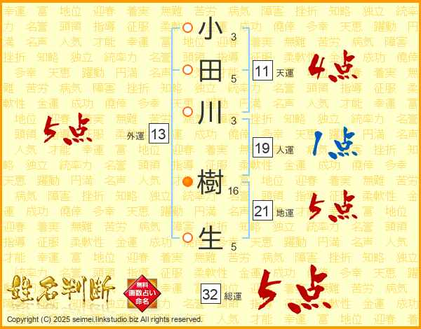 小(3画)田(5画)川(3画) 樹(16画)生(5画)