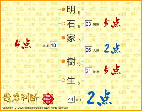 明(8画)石(5画)家(10画) 樹(16画)生(5画)