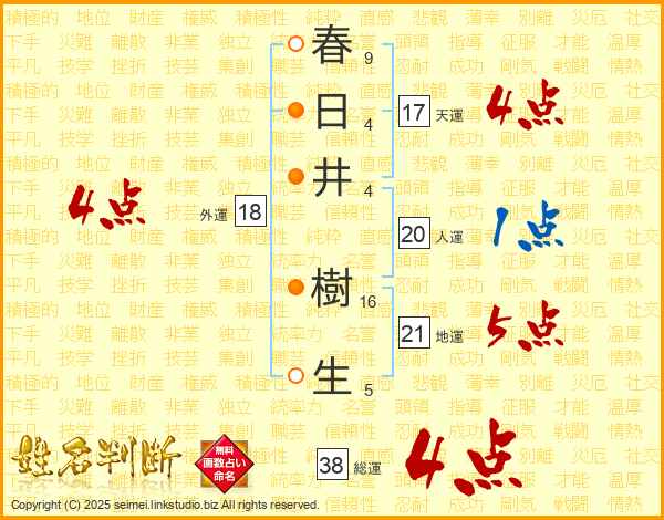 春(9画)日(4画)井(4画) 樹(16画)生(5画)
