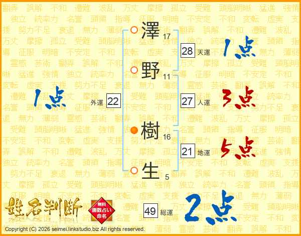澤(17画)野(11画) 樹(16画)生(5画)
