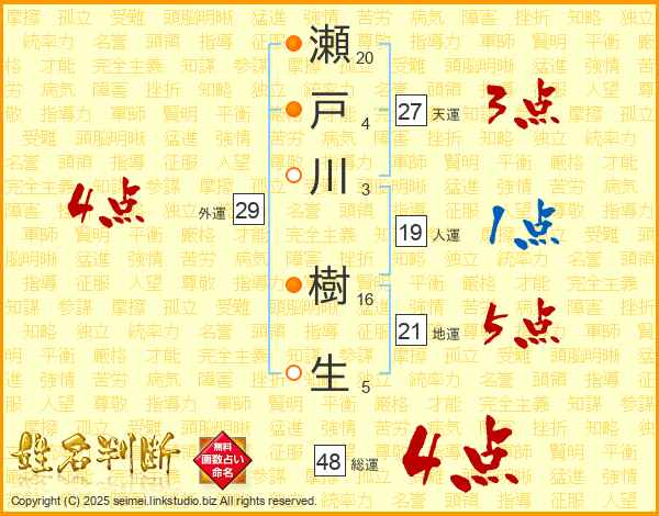 瀬戸川樹生さんの総運は48画の4点!