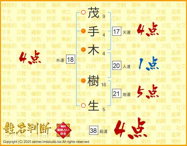 茂(9画)手(4画)木(4画) 樹(16画)生(5画)