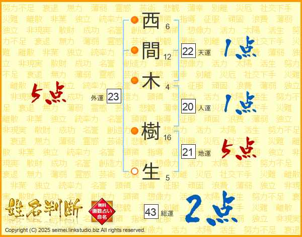 西(6画)間(12画)木(4画) 樹(16画)生(5画)