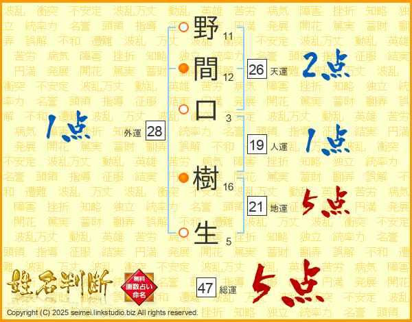 野(11画)間(12画)口(3画) 樹(16画)生(5画)