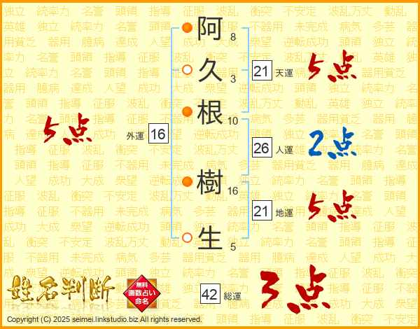 阿(8画)久(3画)根(10画) 樹(16画)生(5画)