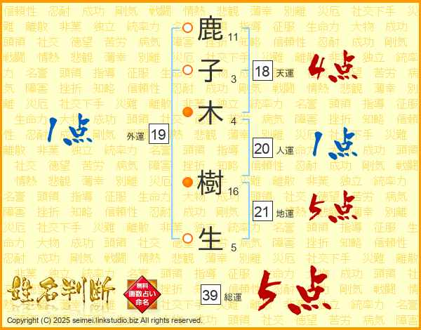 鹿(11画)子(3画)木(4画) 樹(16画)生(5画)