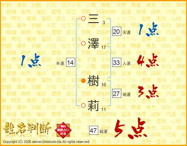 三(3画)澤(17画) 樹(16画)莉(11画)