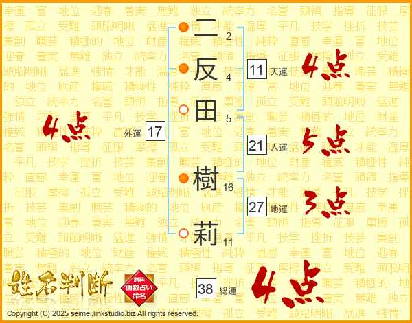 二(2画)反(4画)田(5画) 樹(16画)莉(11画)