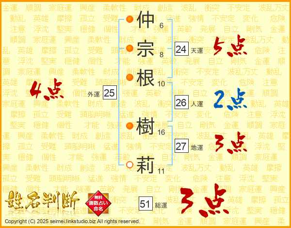 仲(6画)宗(8画)根(10画) 樹(16画)莉(11画)