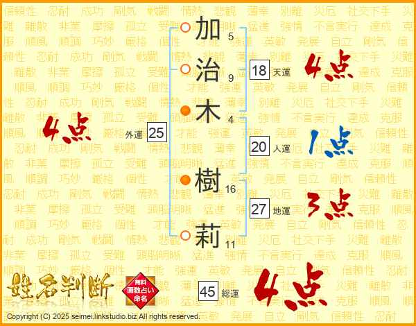 加(5画)治(9画)木(4画) 樹(16画)莉(11画)