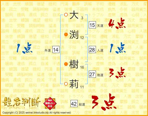 大(3画)渕(12画) 樹(16画)莉(11画)