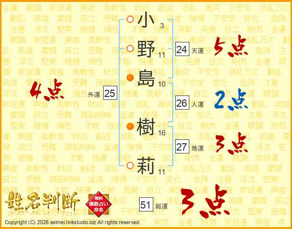 小(3画)野(11画)島(10画) 樹(16画)莉(11画)