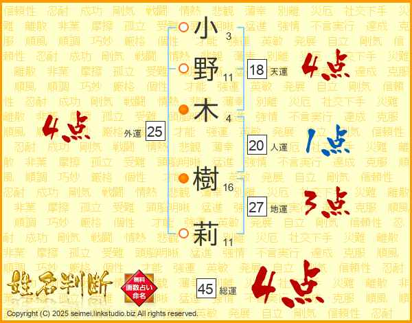 小(3画)野(11画)木(4画) 樹(16画)莉(11画)