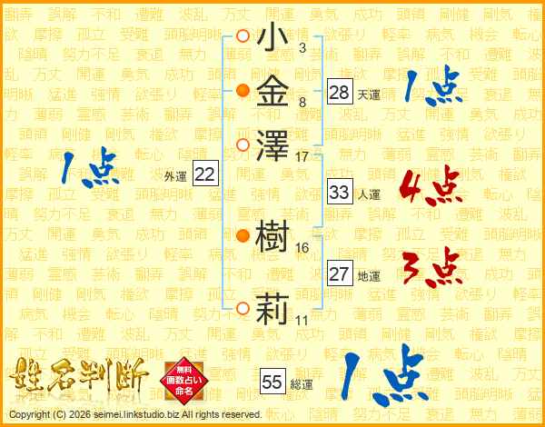 小(3画)金(8画)澤(17画) 樹(16画)莉(11画)